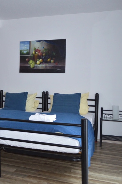 Familienzimmer, bestehend aus 2SZ mit 2 Einzelbetten und einem Doppelbett, die durch Küche und Bad verbunden sind.
