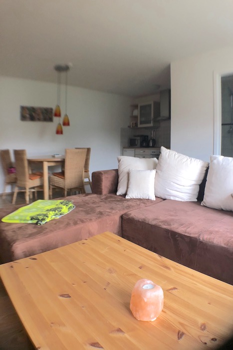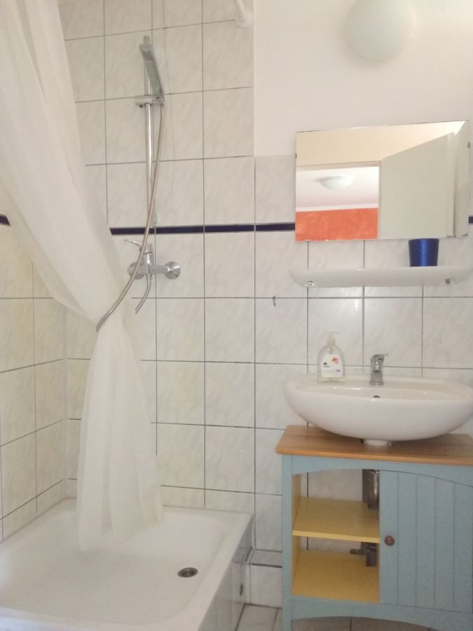 Bad und Dusche getrennt und vom Wohnzimmer aus erreichbar. Wohnzimmer mit integrierter Küche.