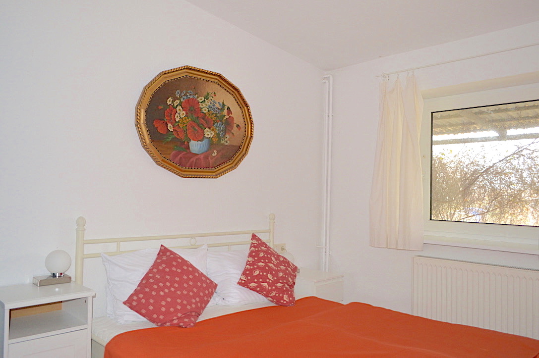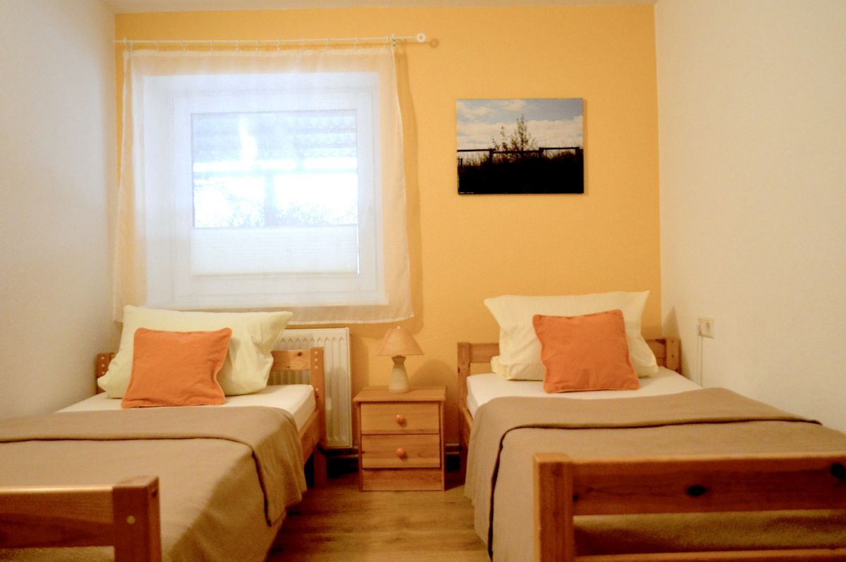 Große Ferienwohnung mit 2 Schlafzimmer (1x Doppelbett und 1x 2 Einzelbetten) und einem Wohnzimmer mit einer Schlafcouch.